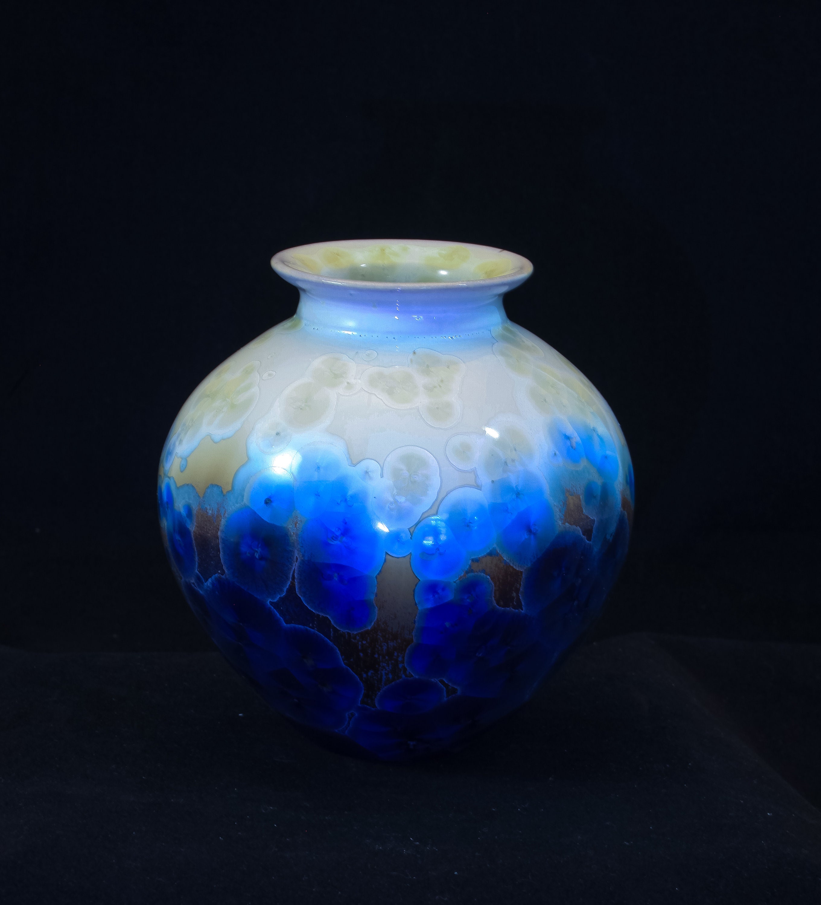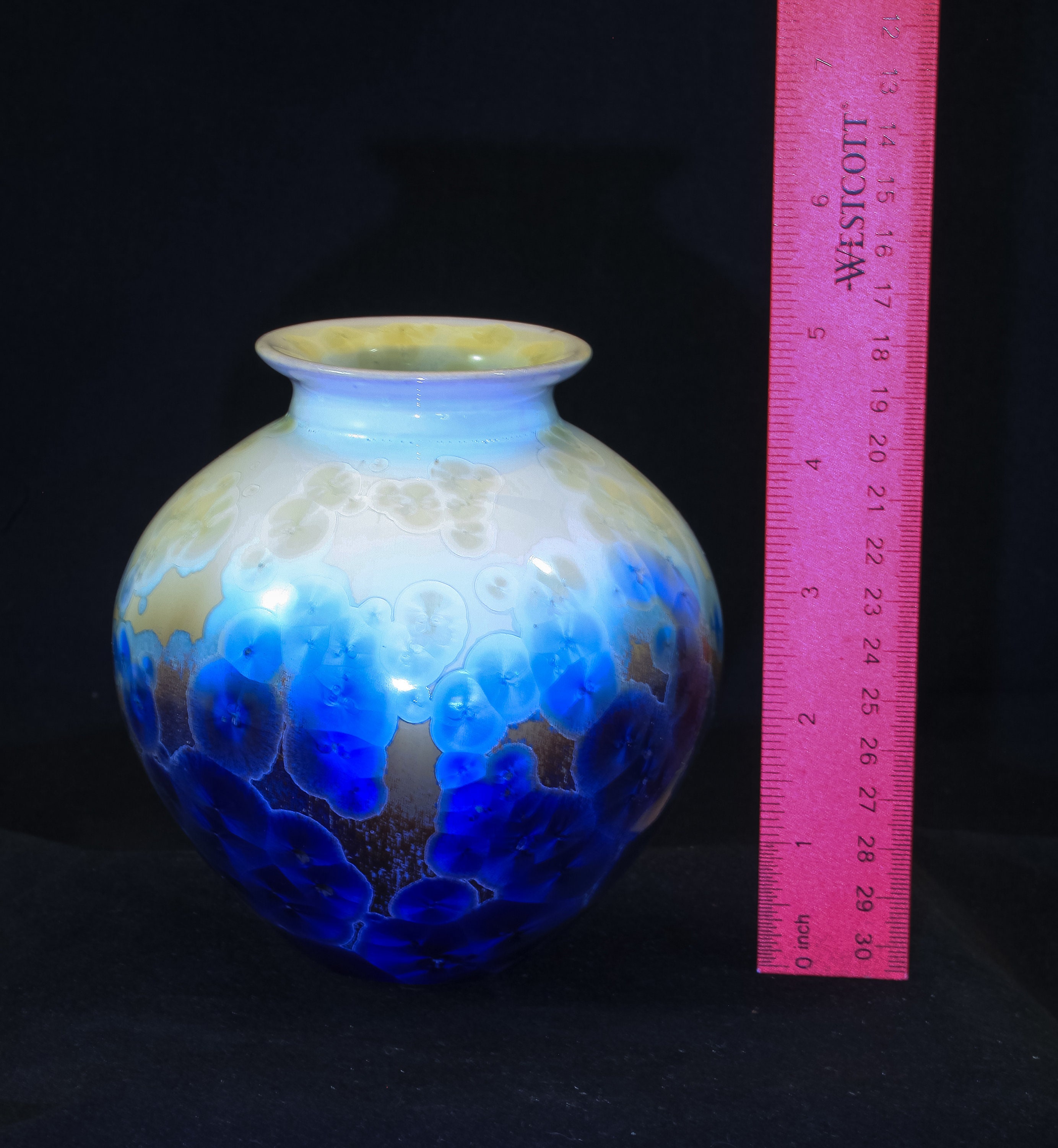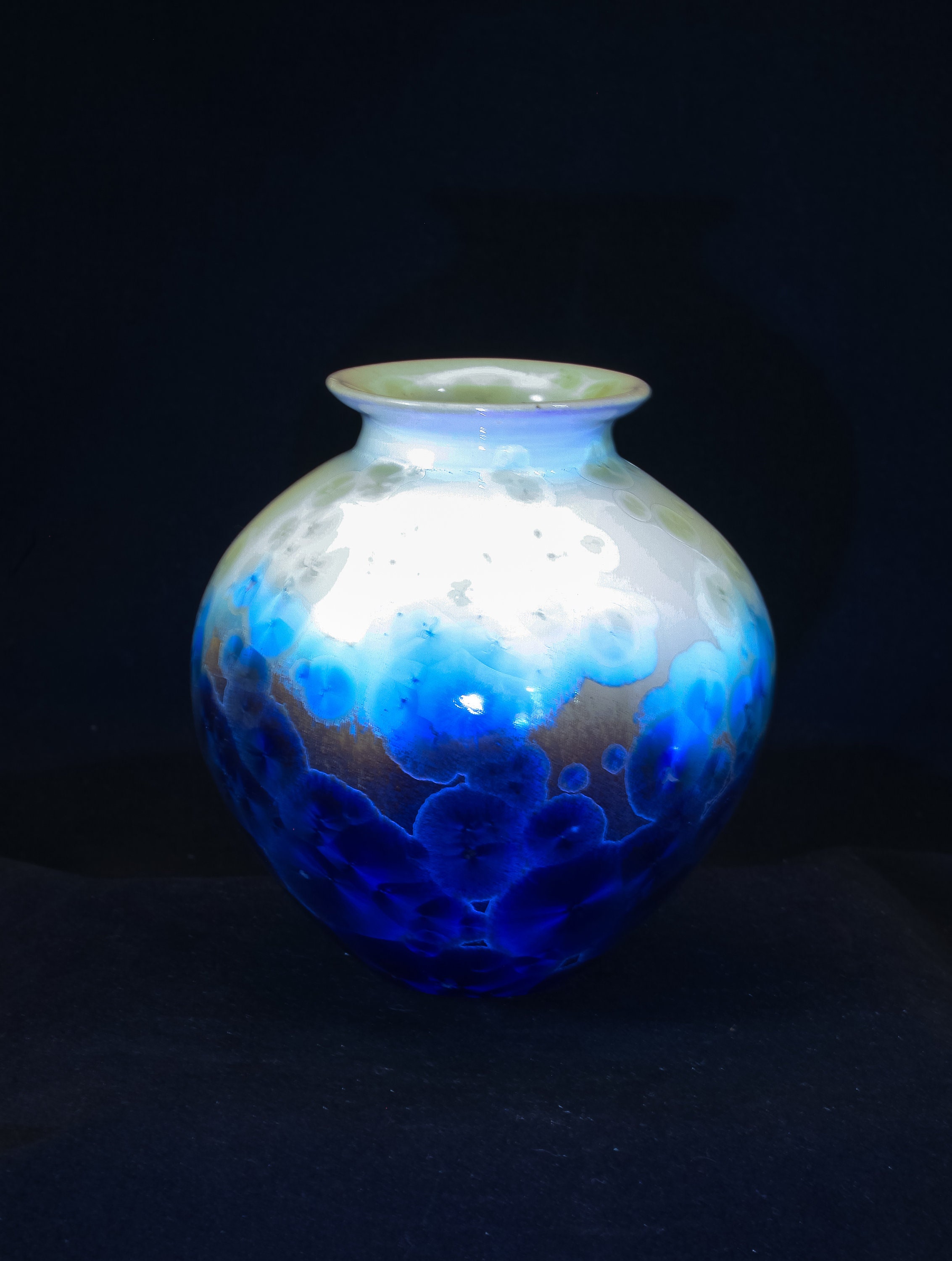 Production Notes - The blending process is a wonderful look to mix several of my favorite colors. This one starts white, but then plunges into blue crystals on a copper cats-eye background. Very unusual.