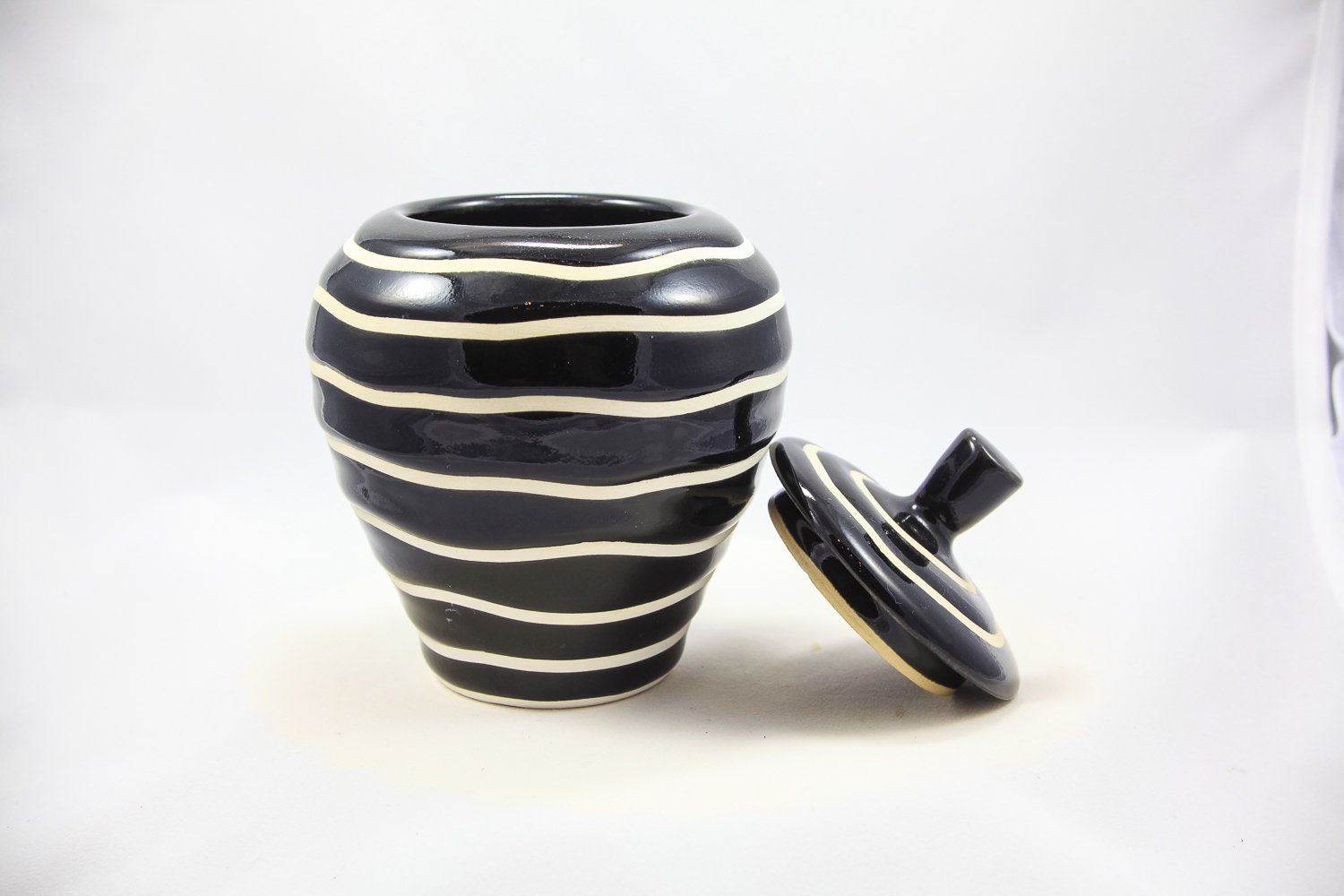 My bowls and vases are fired TWICE in a kiln, the first firing is a bisque fire where I apply an underglaze color by hand - typically three coats of color so there is layer of background color on every piece. After that firing, I then create the intricate designs with special adhesive tape and/or dots to create the modern contemporary look of my pottery. After the design, three more coats of glaze color are hand painted on. When dry, I remove the tape and dots and on select items, give the bottoms a distinctive red coat. At this time, I return to the kiln to fire the finished piece to a wonderful lead-free gloss finish.